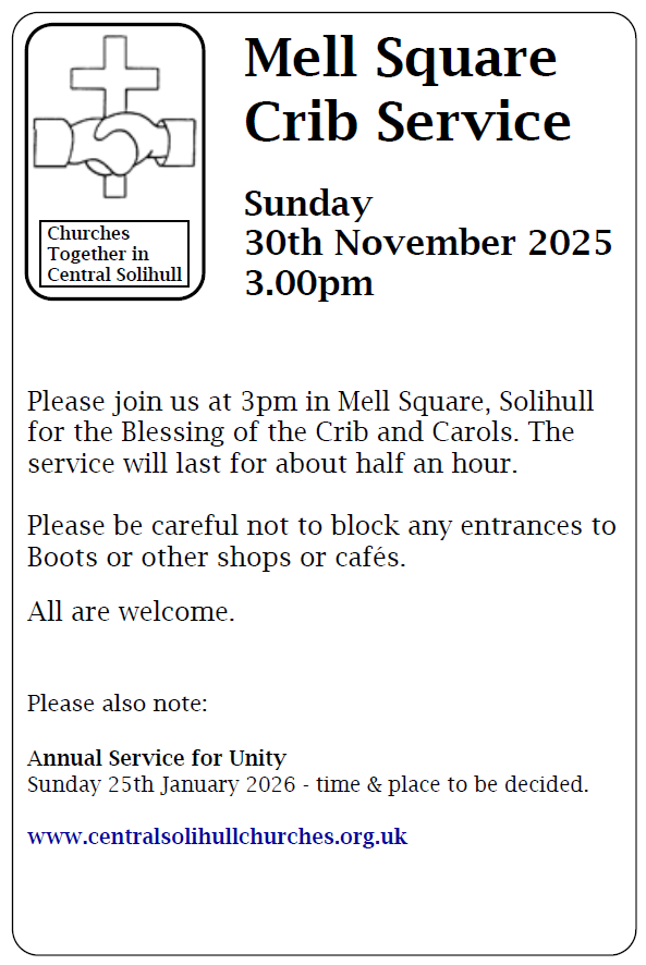 Crib Service – Sunday 30th November, 3pm in Mell Square, Solihull. Click here for details.